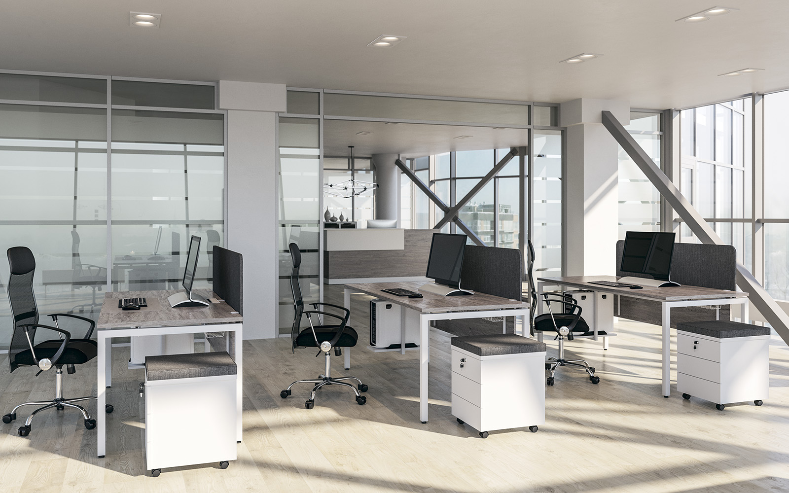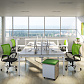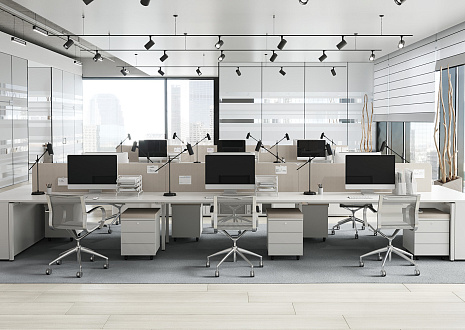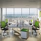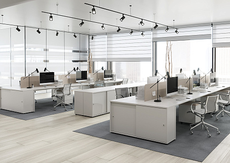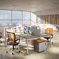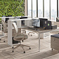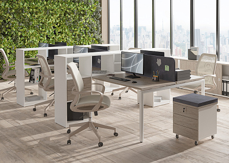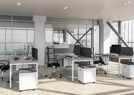 - Предусмотрена возможность группировать столы за счет промежуточных П-образных металлических опор — одиночной и сдвоенной. На сдвоенной промежуточной опоре ножки сдвинуты внутрь стола для комфортной работы сотрудников и установки мобильных тумб. При формировании группированных рабочих станций используются стандартные столешницы и траверсы.