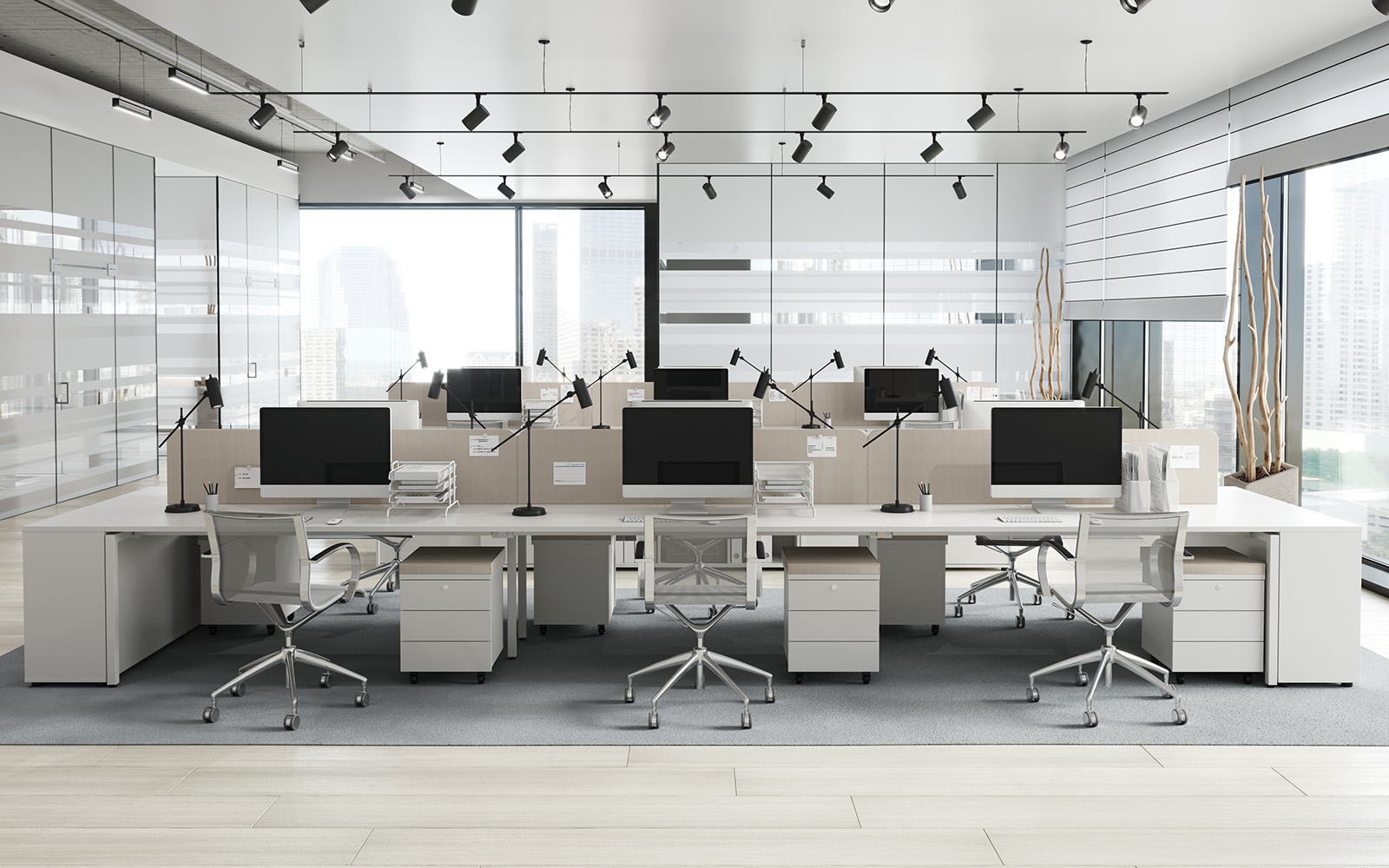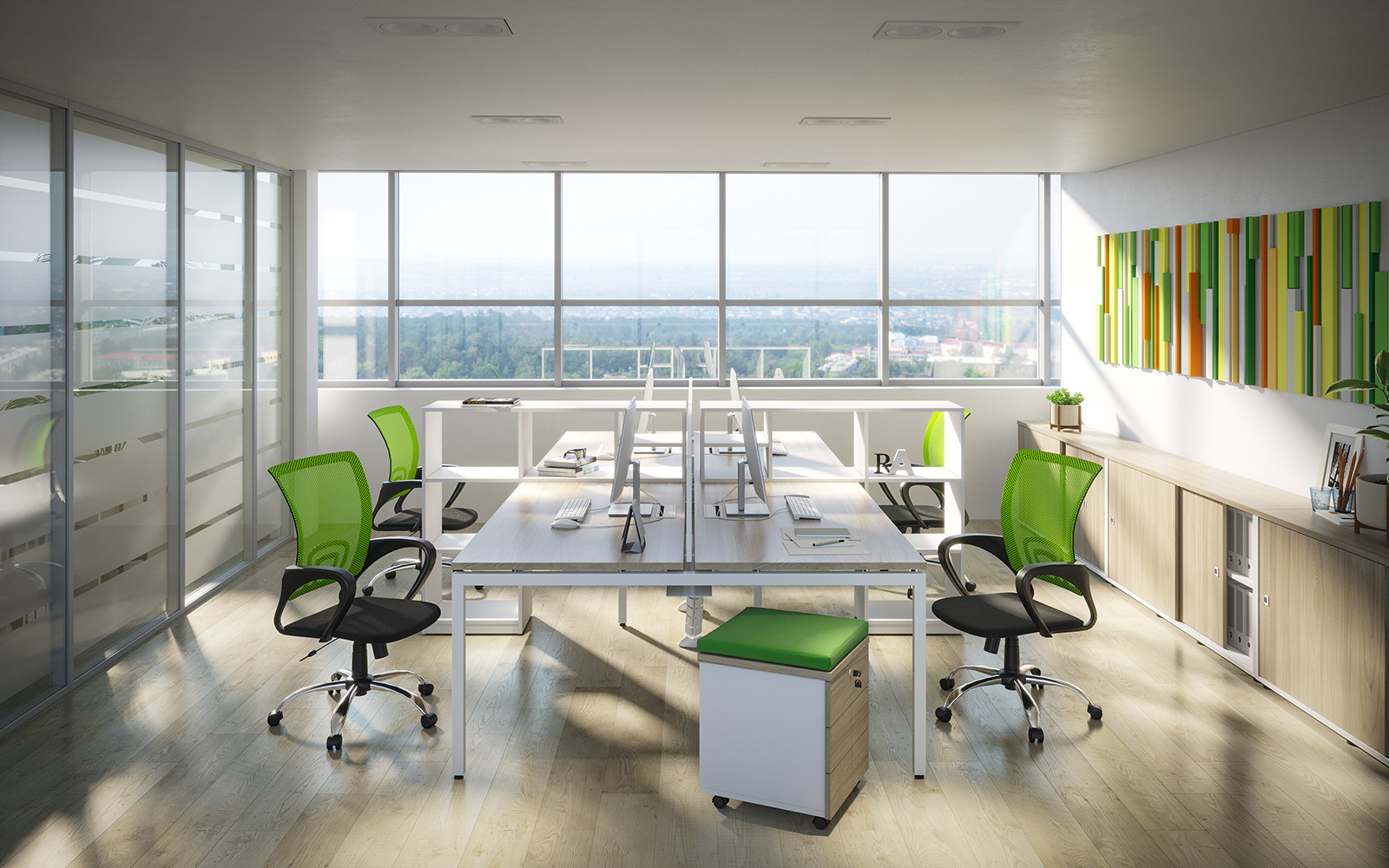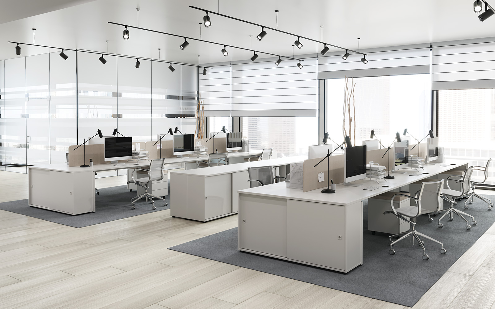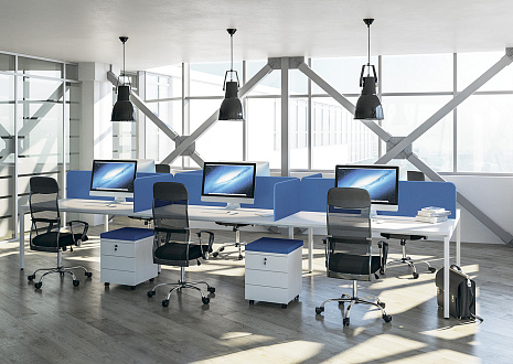 - Три варианта исполнения экранов-перегородок: ЛДСП, молочный акрил и ЛДСП с шумопоглощающими тканевыми чехлами.