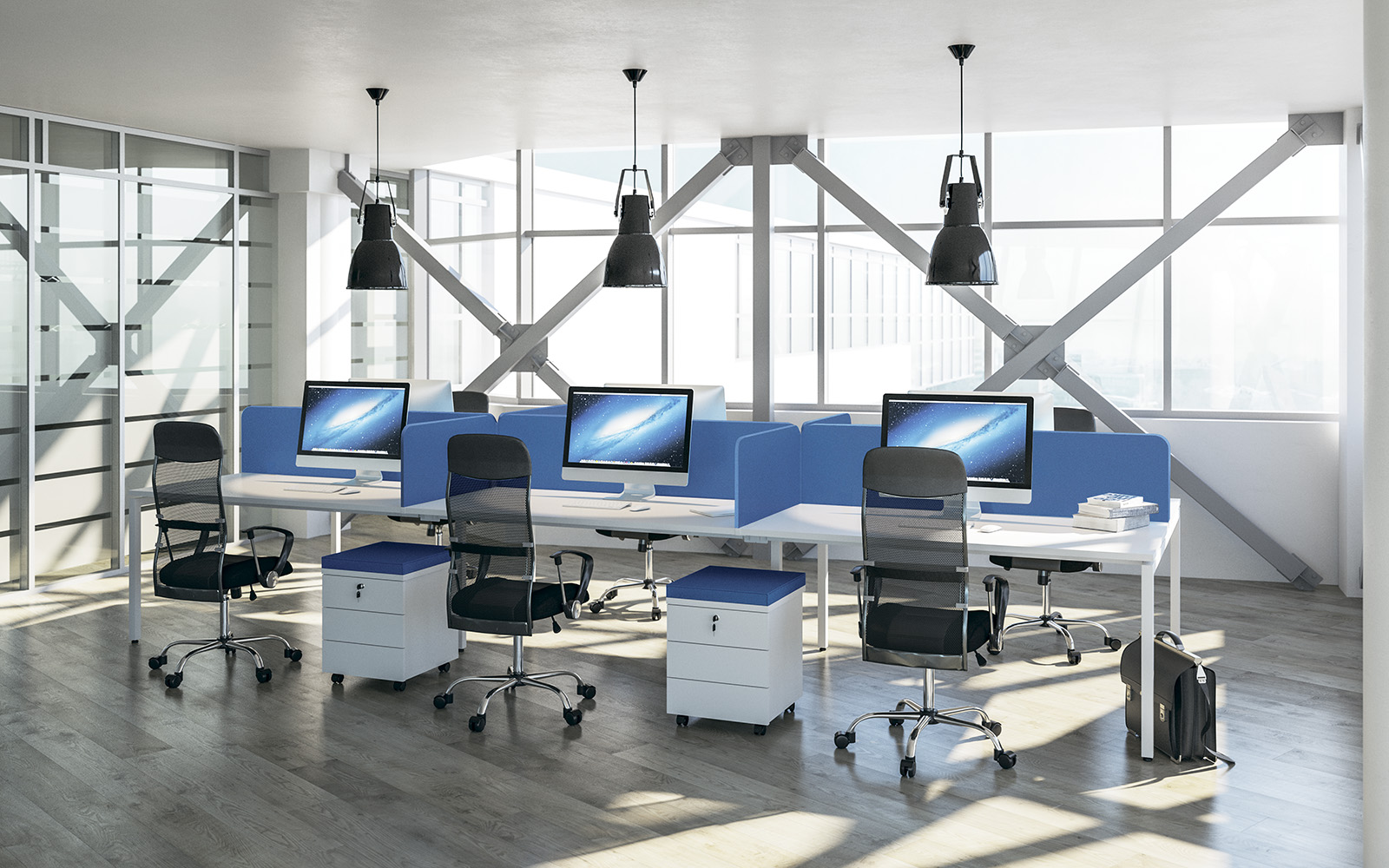 - Аксессуары, улучшающие эргономику рабочего места: экраны-перегородки, полки, подвесные траверсы, кабель-каналы, держатели системного блока.